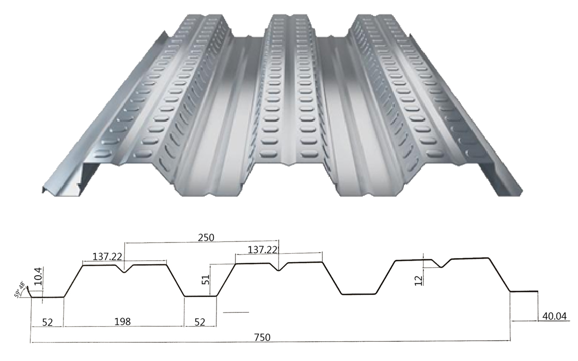 Las hojas para pisos también se conocen como plataforma de acero perfilada, cubierta de metal, cubiertas de techo, etc. El nombre más antiguo de bondek se llama plataforma de acero corrugado, y todas las hojas de pisos de acero que están prensadas y formadas por una prensa de platina y se denominan colectivamente .La losa del piso está hecha de chapa de acero galvanizada por laminación en frío, y su sección transversal es en forma de V, en forma de U, trapezoidal o similar. Se utiliza principalmente como plantilla permanente y también puede seleccionarse para otros fines. Las primeras láminas compactas de acero compactado se utilizaron principalmente como paneles de techo del techo de la fábrica, seguidas de las planchas de acero perfiladas utilizadas para los pisos y clasificadas gradualmente como planchas de suelo. YX51-250-750 es un tipo de cubierta de piso de compuesto típico, aquí presentaremos más sobre este modelo.