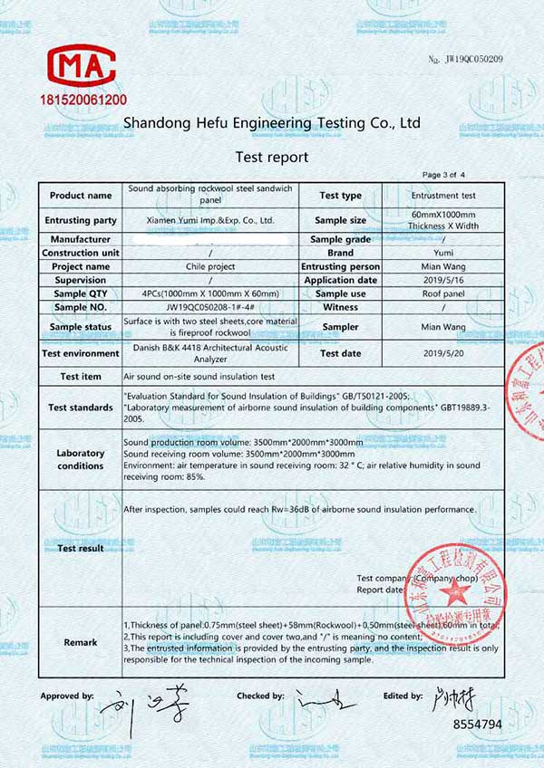Nota: esta prueba se basa en el grosor del panel: 60 mm, densidad de lana de roca: 120 kg / m³, el grosor externo de la lámina es de 0,75 mm y el grosor interno de la lámina es de 0,50 mm.